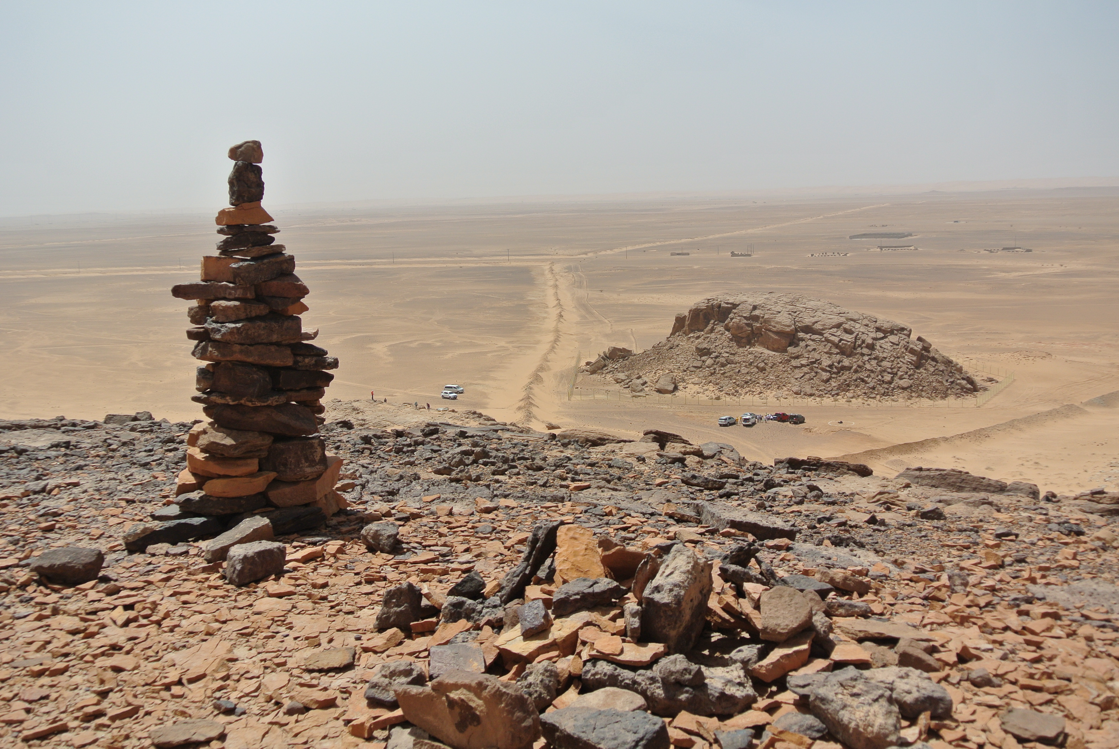 We set off in a taxi van and an SUV. The site is about 120 kms from the Riyadh,  for most of which there is highway but the last 4 kms are off road,  we don’t know if the driver will be able to get the van all the way there.  The taxi is quite uncomfortable and I have a middle seat,  I am also itchy and hot in the abaya.  Our able organizer gives us a lecture about the site,  and directs the taxi with maps he has downloaded from the internet.  We reach the turn off from the main road,  and track looks okay so the taxi follows the SUV,  after we cross a rocky ridge we can see the rock which sits up on its own out of the rocky desert near to an escarpment.
